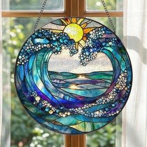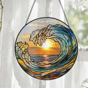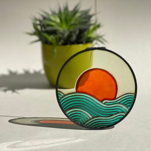 Ocean Wave Sunset Stained Glass Suncatcher, Coastal Window Hanging Decor, Blue Sea Art Sun Catcher, Beach Lover Gift