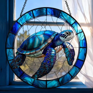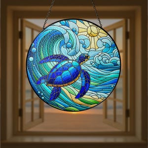 Sea Turtle Stained Glass Suncatcher, Ocean Turtle Window Hanging, Round Coastal Home Decor