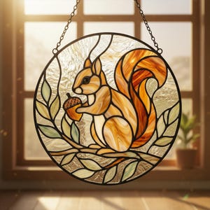 Squirrel Stained Glass Suncatcher, Cute Woodland Squirrel Window Hanging, Forest Animal Glass Art, Nature Lover Gift