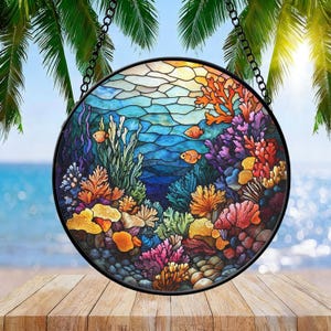 Stained Glass Suncatcher: Ocean Coral Reef, Colorful Fish Window Art