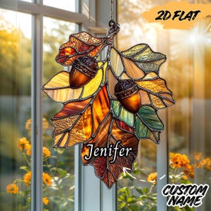 Woodland Acorn & Oak Leaf Acrylic Window Hanging – Rustic Faux Stained Glass Suncatcher, Fall Harvest Farmhouse Decor