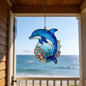 Vibrant Dolphin Window Decor – Stained Glass Ocean Suncatcher – Nautical Gift & Marine Life Art-Coastal Nursery Decor – Ocean Lover Gift