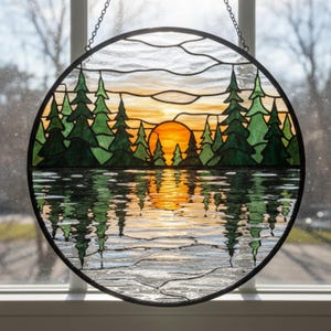 Sunset Lake and Pine Forest Stained Glass Suncatcher, Nature Landscape Window Hanging, Mountain Reflection Decor, Gift for Mom, Grandma